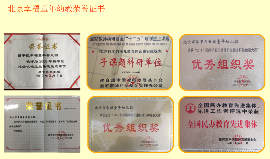 为让更多的孩子拥有快乐、幸福的童年,让他们赢在人生最初的起跑线,北京幸福童年幼教本着“促提高、出佳绩、丰内涵、显特色、提品位”办园理念,始终坚持以人为本、与时俱进、追求卓越,经过17年不懈的努力和发展,幸福童年已经成为家长满意、幼儿喜欢、社会赞誉的知名教育品牌,成为了北京幼教界一颗璀璨的明珠。公司所属幼儿园先后获昌平区卫生保健先进单位、北京市教委民办银星幼儿园、全园百佳幼儿园、全国民办教育先进集团、中国妇女儿童最喜爱的教育机构、全园百强幼儿园以及全国先锋幼儿园等殊荣。
