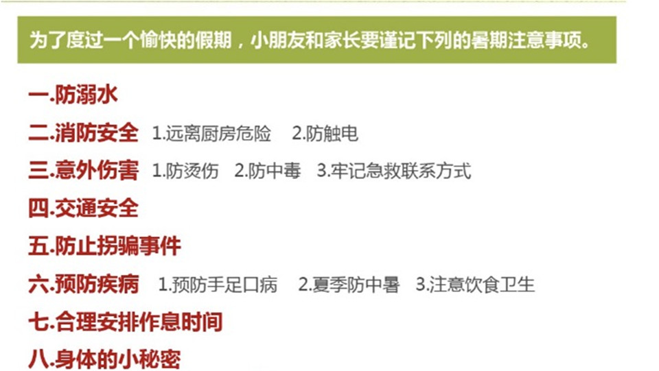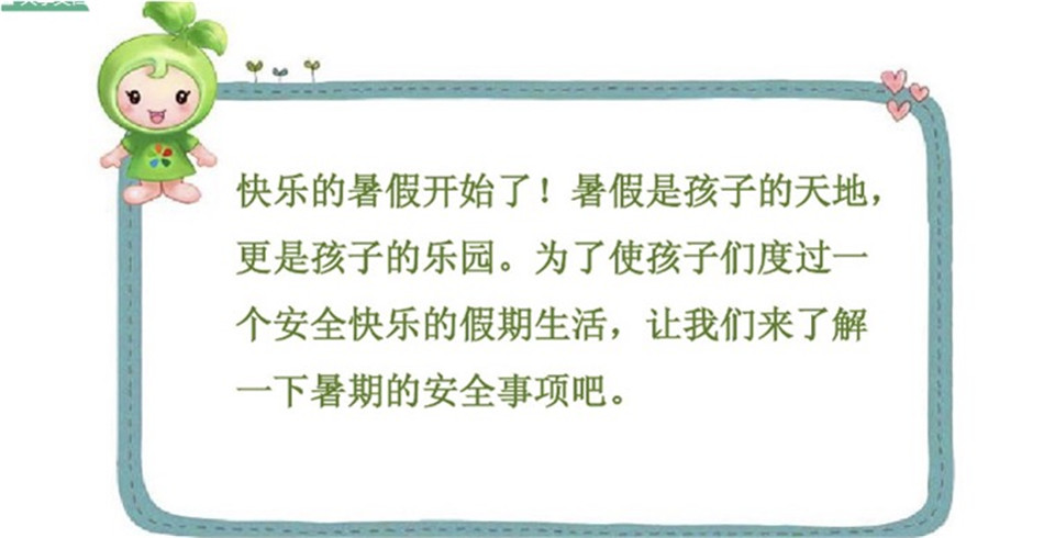 亲爱的老师们、家长们!让我们一起了解幼儿暑期安全注意事项,让幼儿度过一个安全、快乐的假期生活!