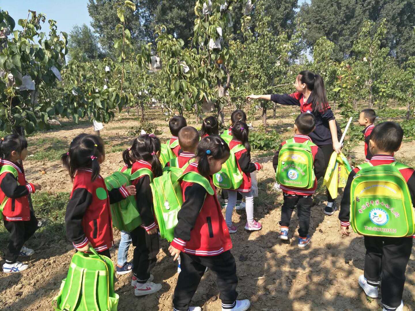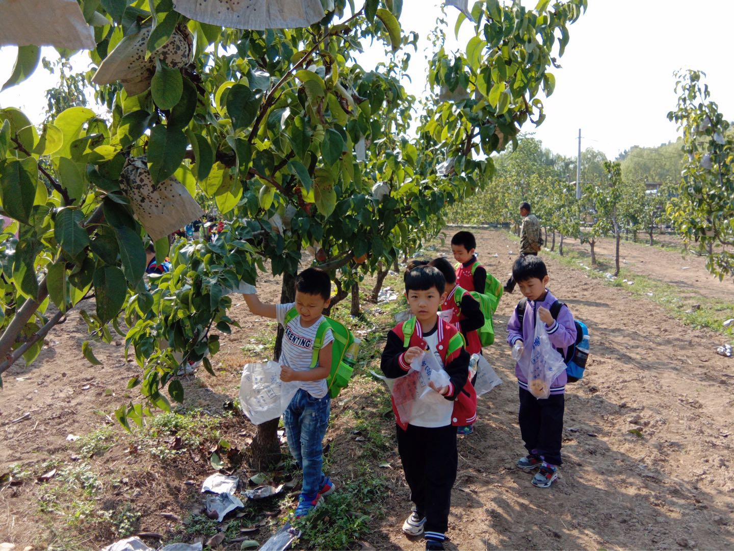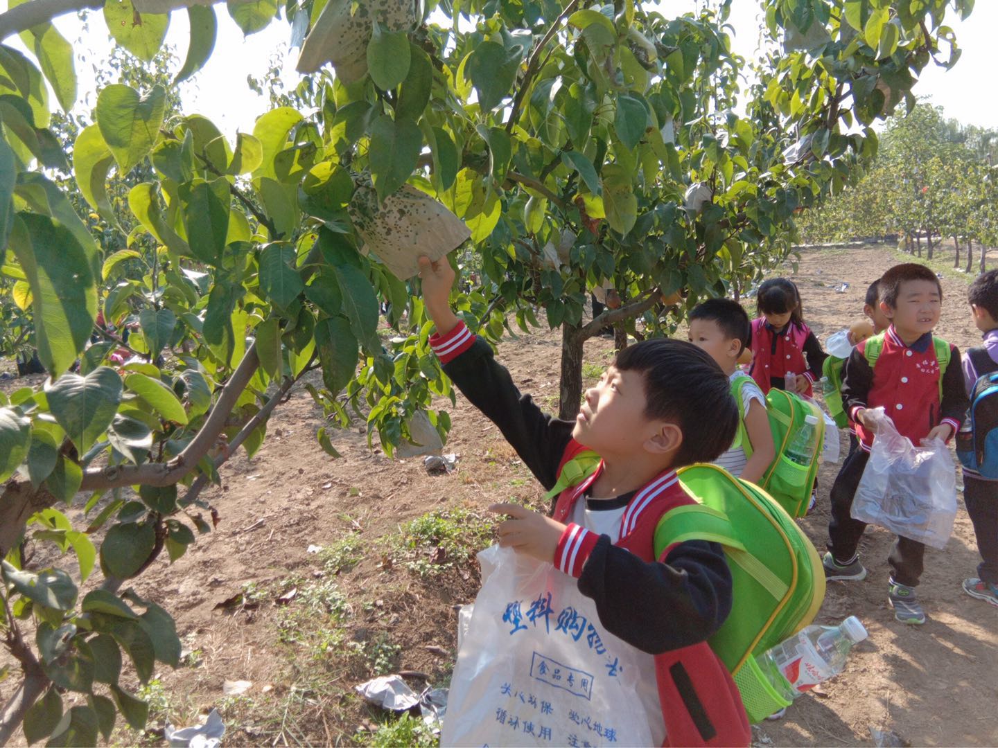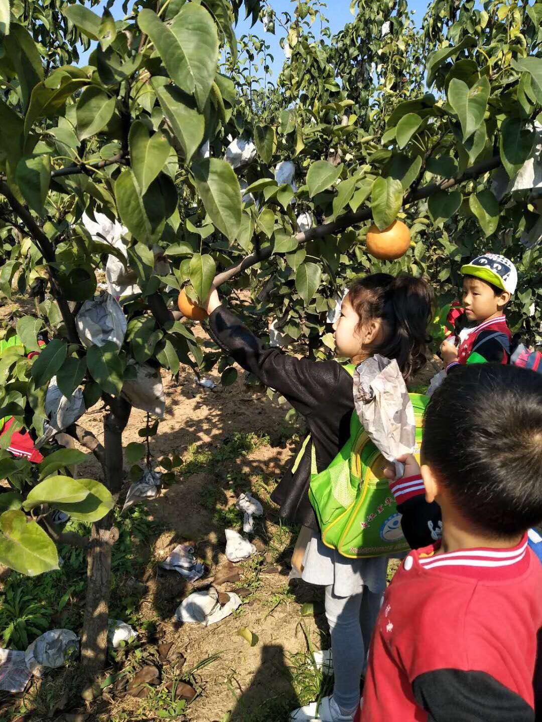 一路欢声笑语,队伍很快就来到了“采摘园”,看着平时香甜可口的梨以这样的方式出现在眼前,孩子们惊喜又好奇,在老师的引导下了解了梨的种植知识和采摘技巧。