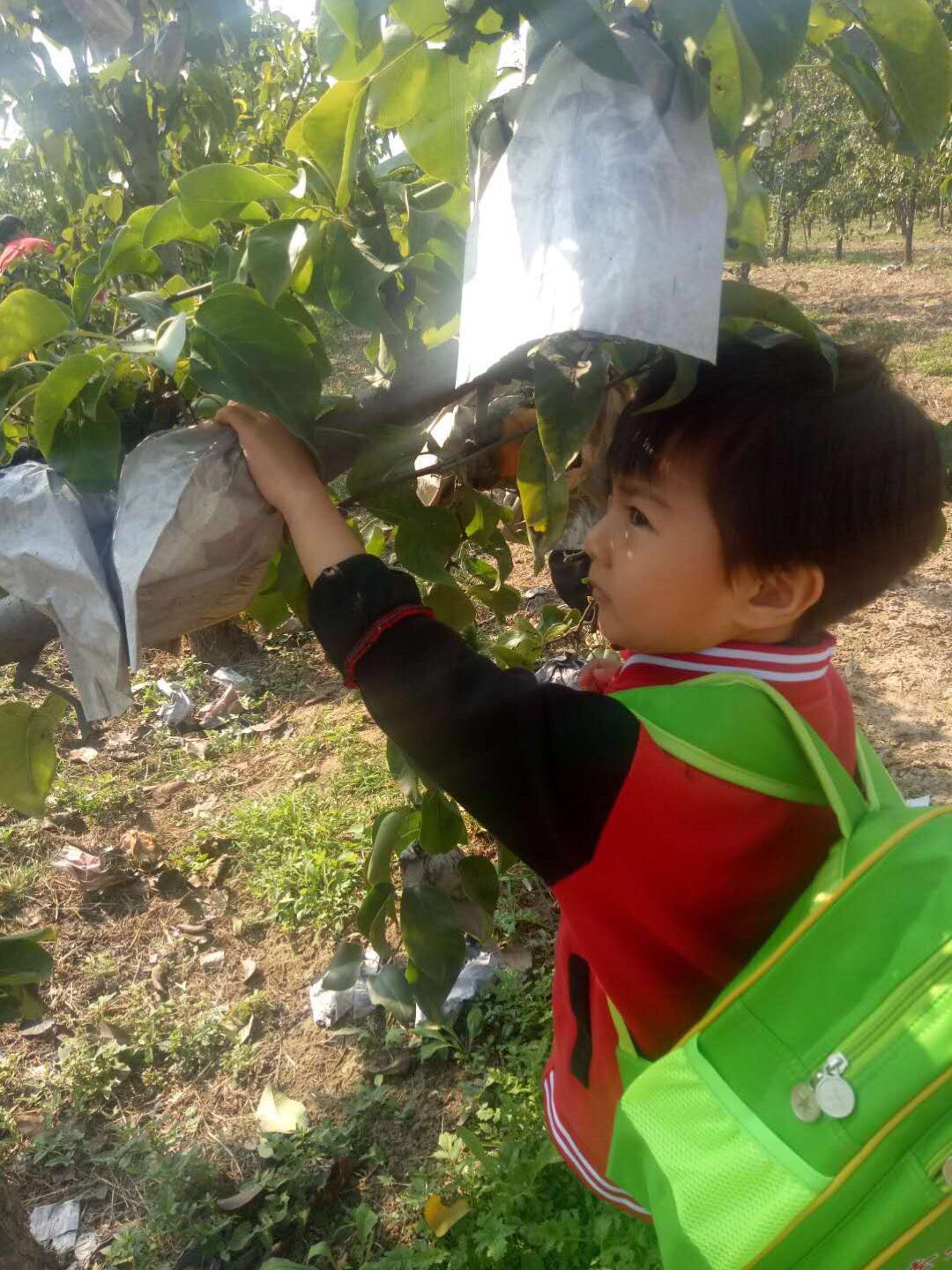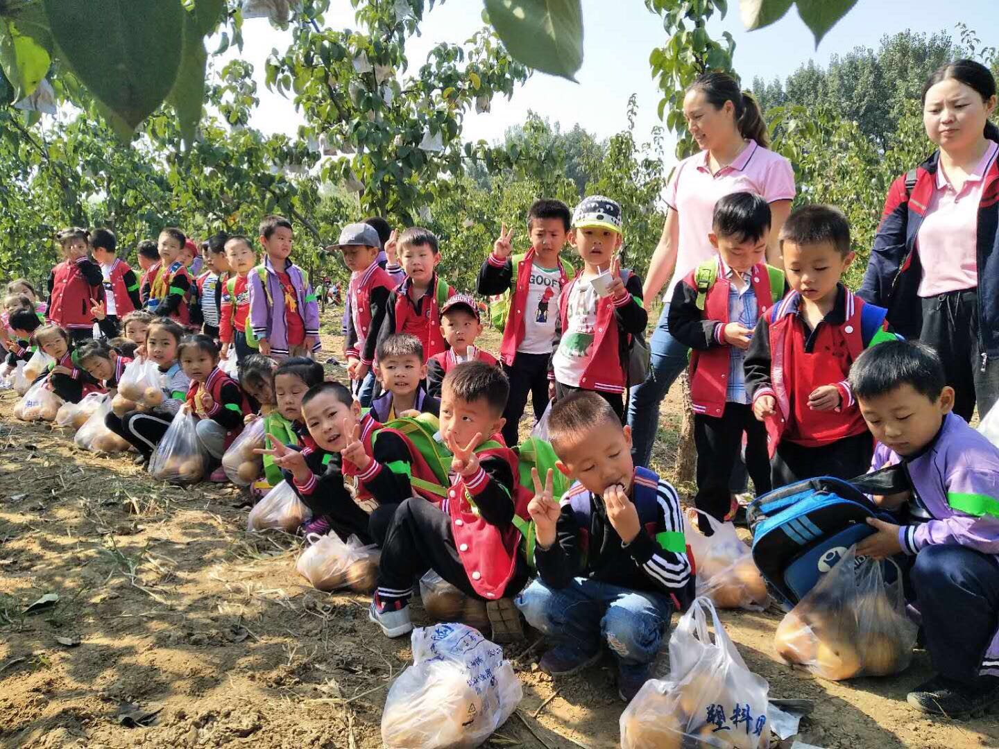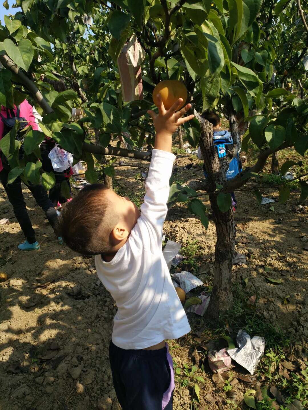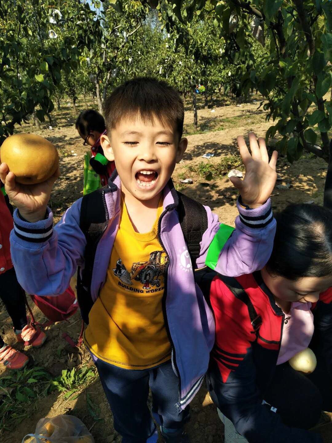 孩子欢呼雀跃,摘得不亦乐乎,老师们则做起了助手,为了让孩子们能摘到高枝上的大梨,果断充当人工梯子。