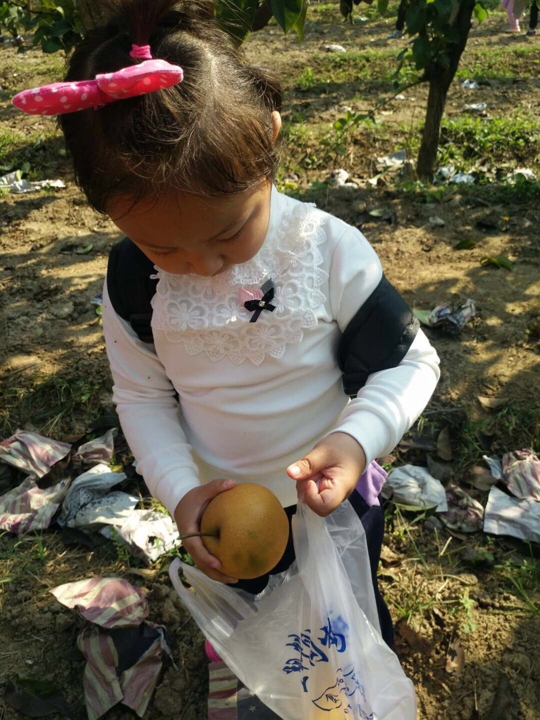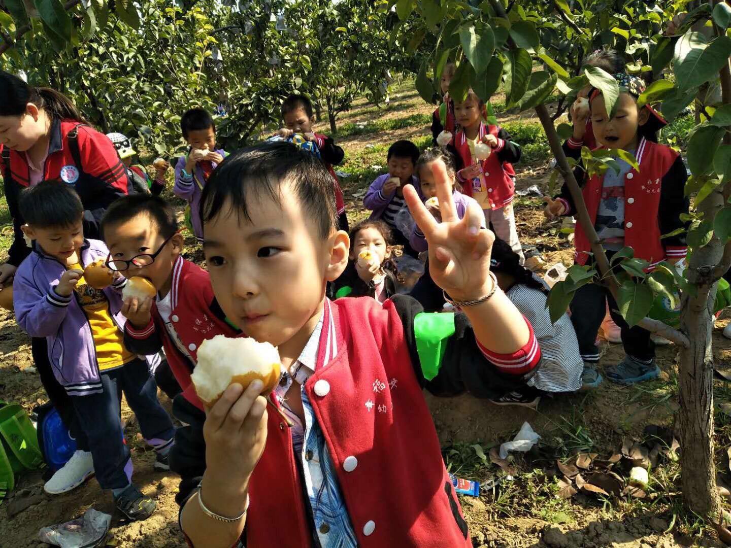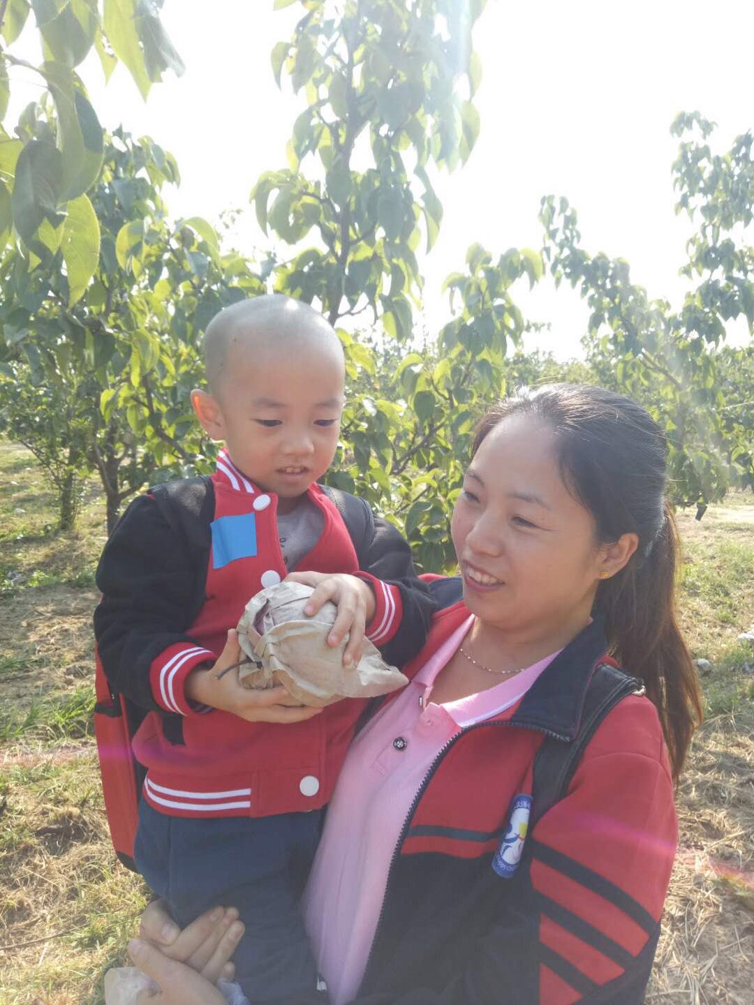 孩子欢呼雀跃,摘得不亦乐乎,老师们则做起了助手,为了让孩子们能摘到高枝上的大梨,果断充当人工梯子。