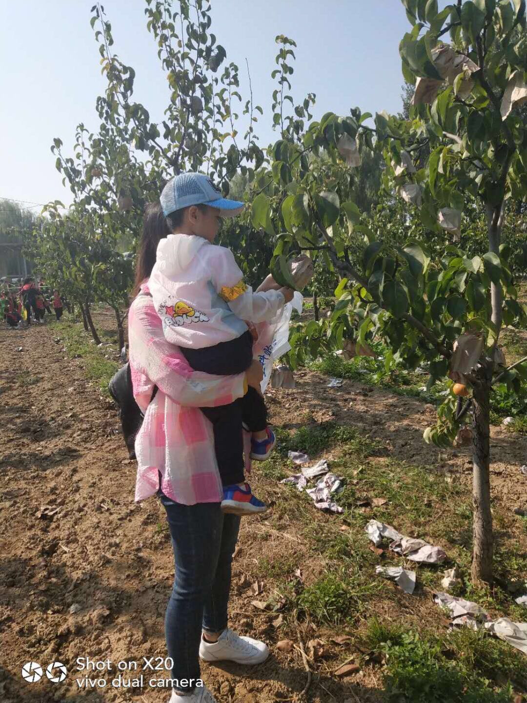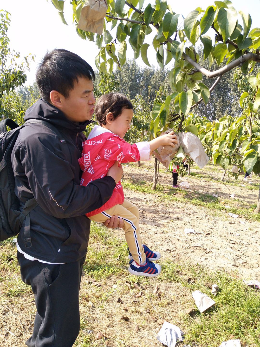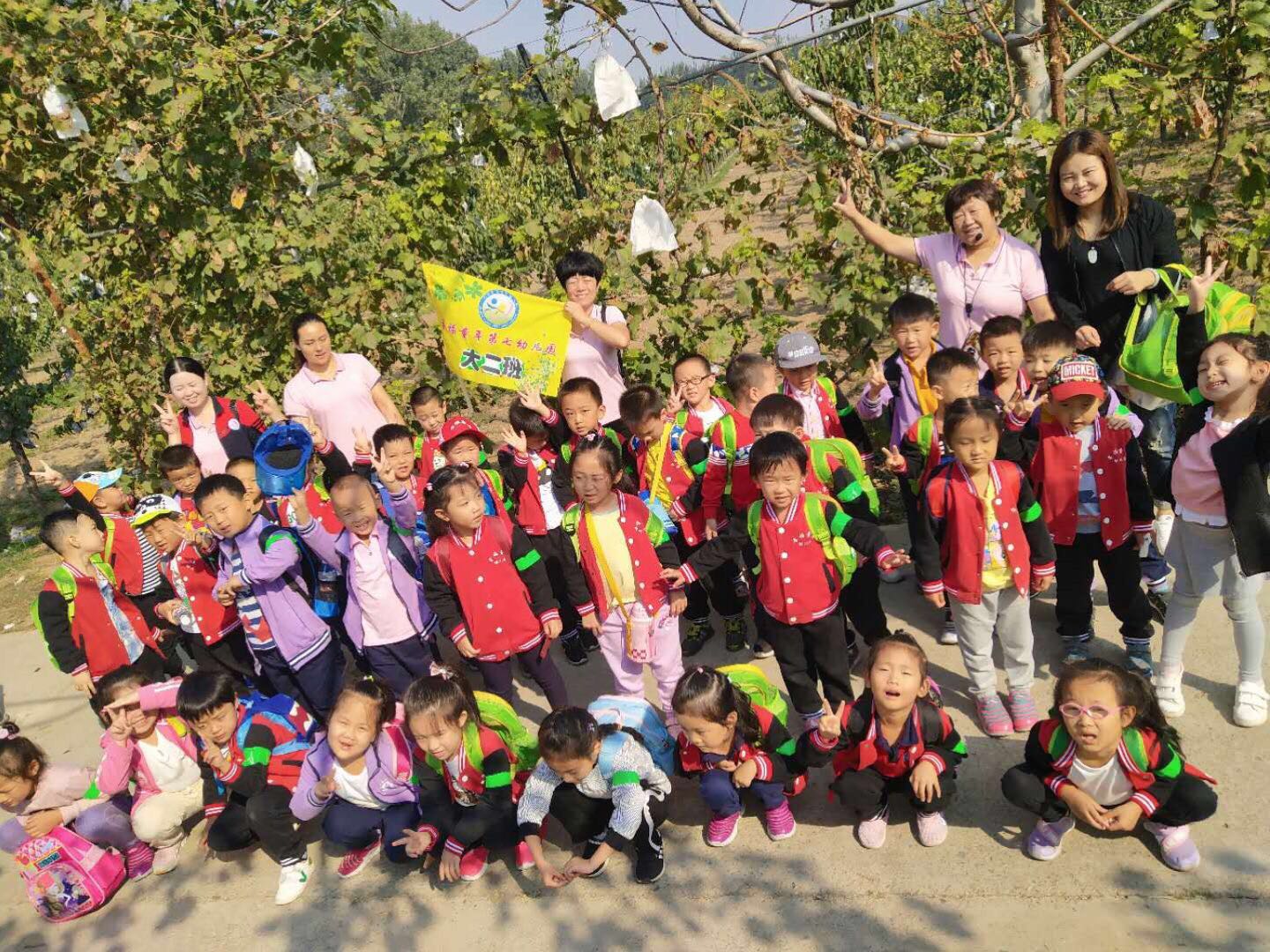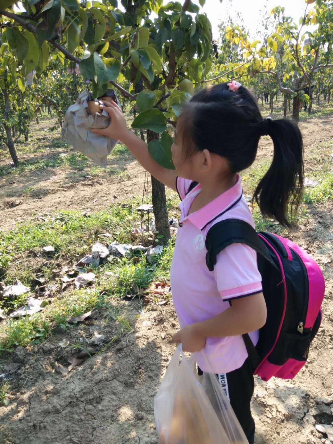 孩子欢呼雀跃,摘得不亦乐乎,老师们则做起了助手,为了让孩子们能摘到高枝上的大梨,果断充当人工梯子。