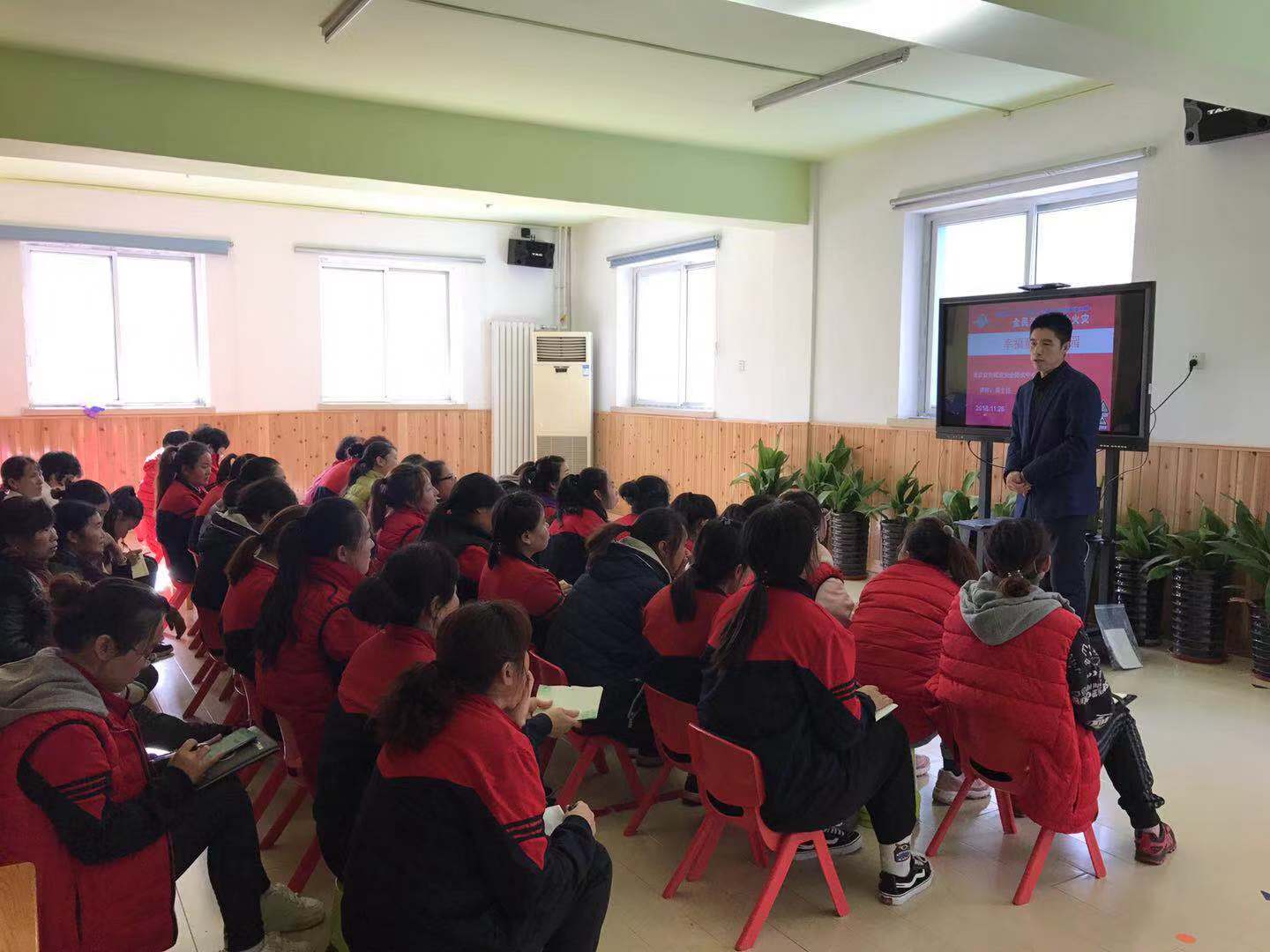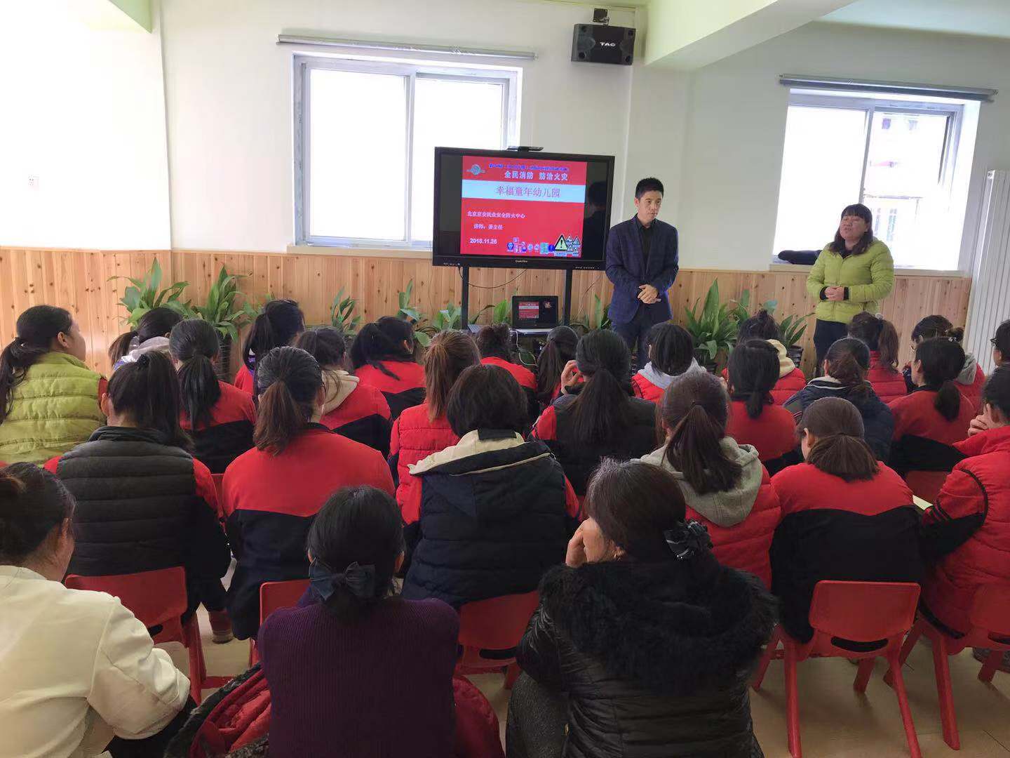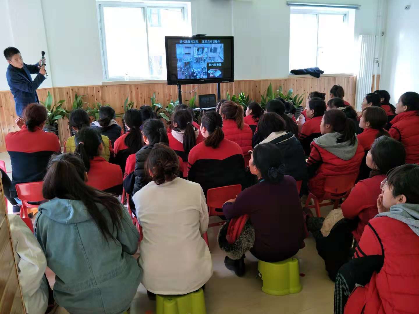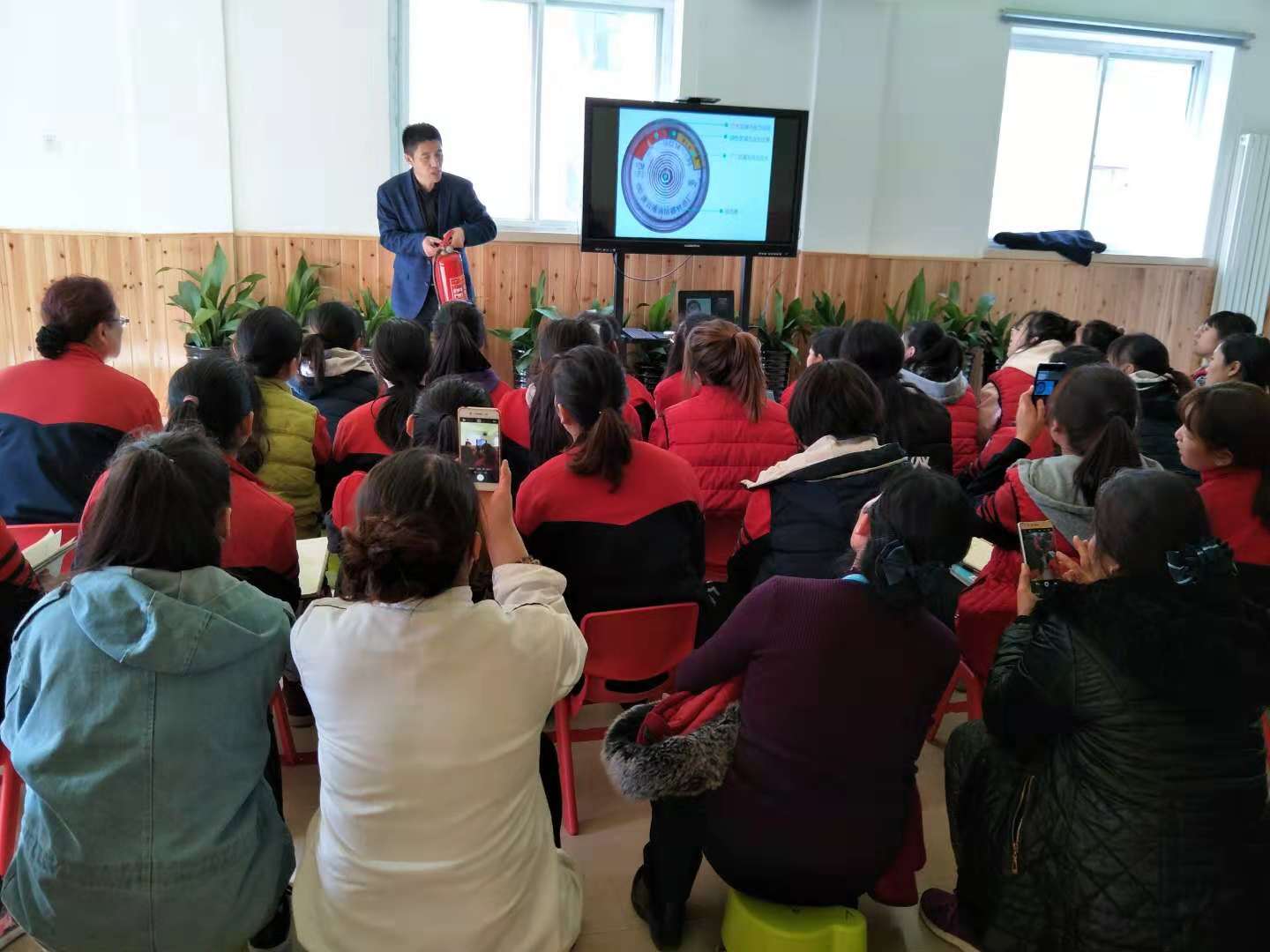 为了增强校园消防安全工作,预防和遏制校园火灾事故的发生,全面引导教职工学习消防安全知识,提高教职工消防安全意识和自防自救能力。11月27日中午12:30,幸福童年第七幼儿园邀请京安防火机构姜老师带领全园教职工在幼儿园开展了“预防为主、防消结合”为主题的消防知识培训。