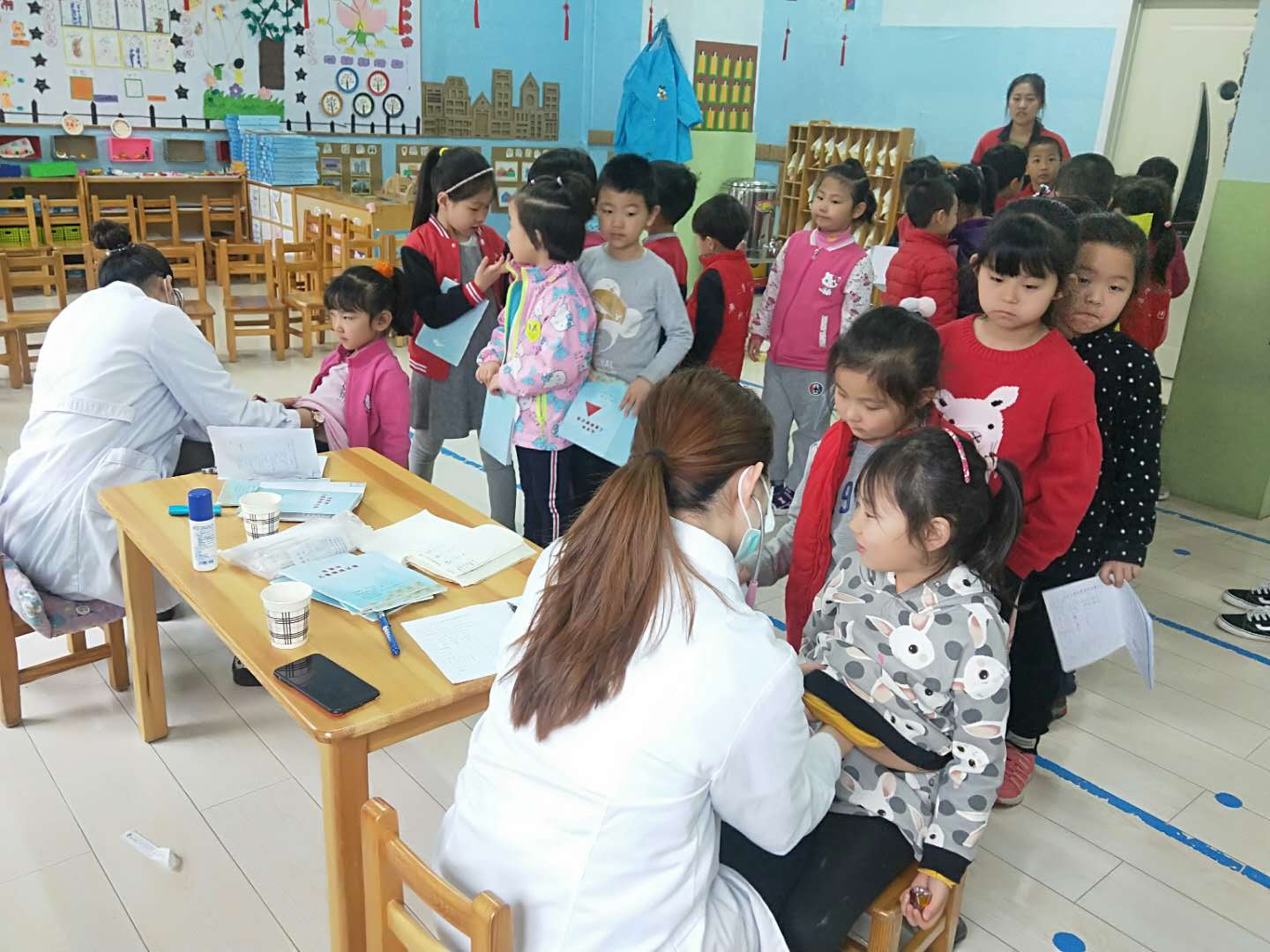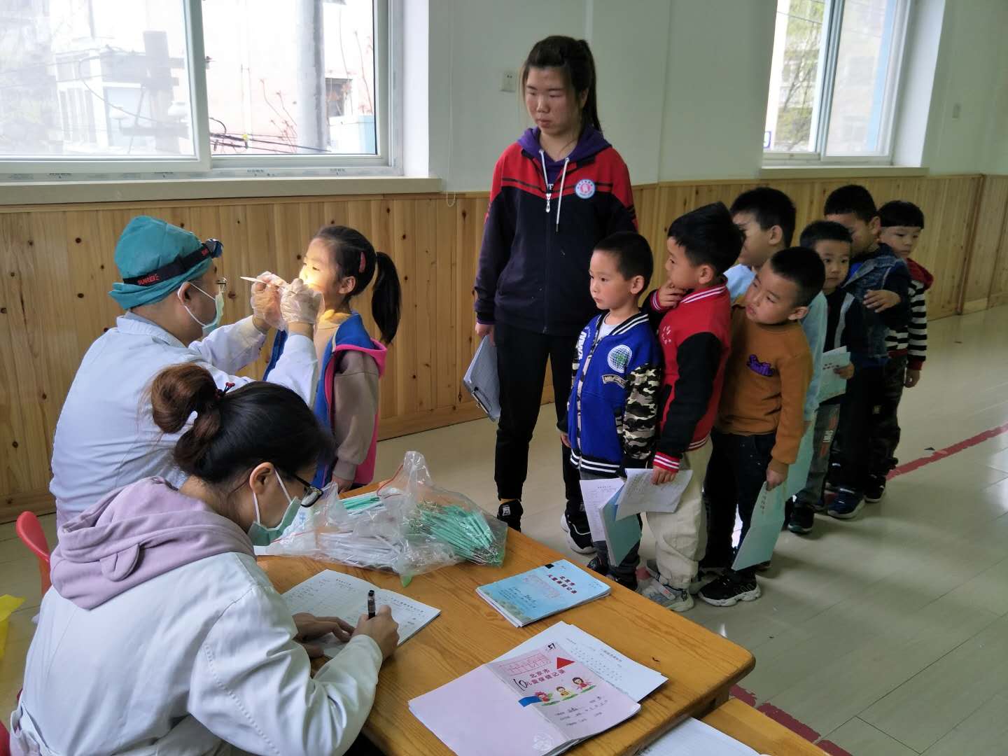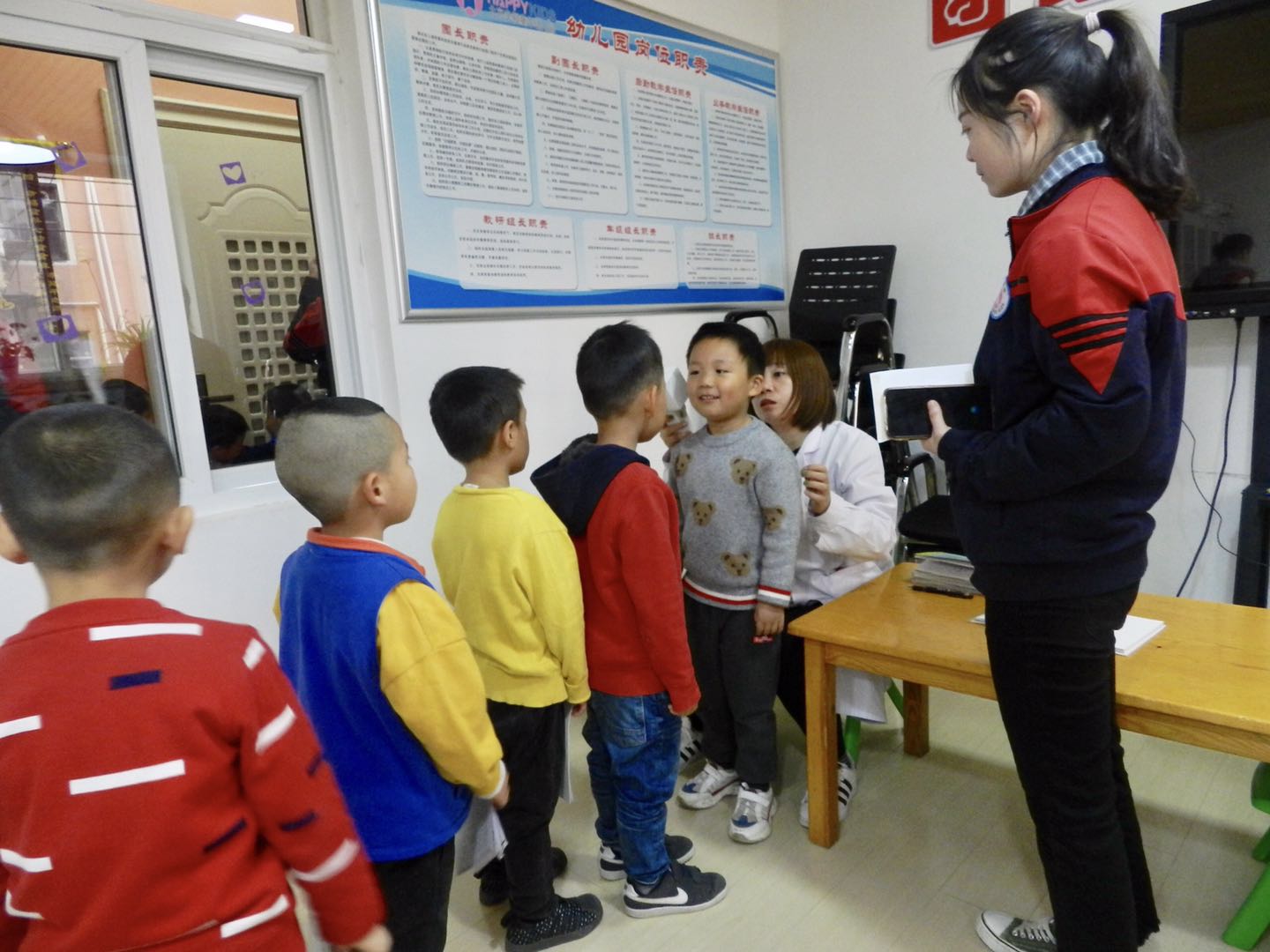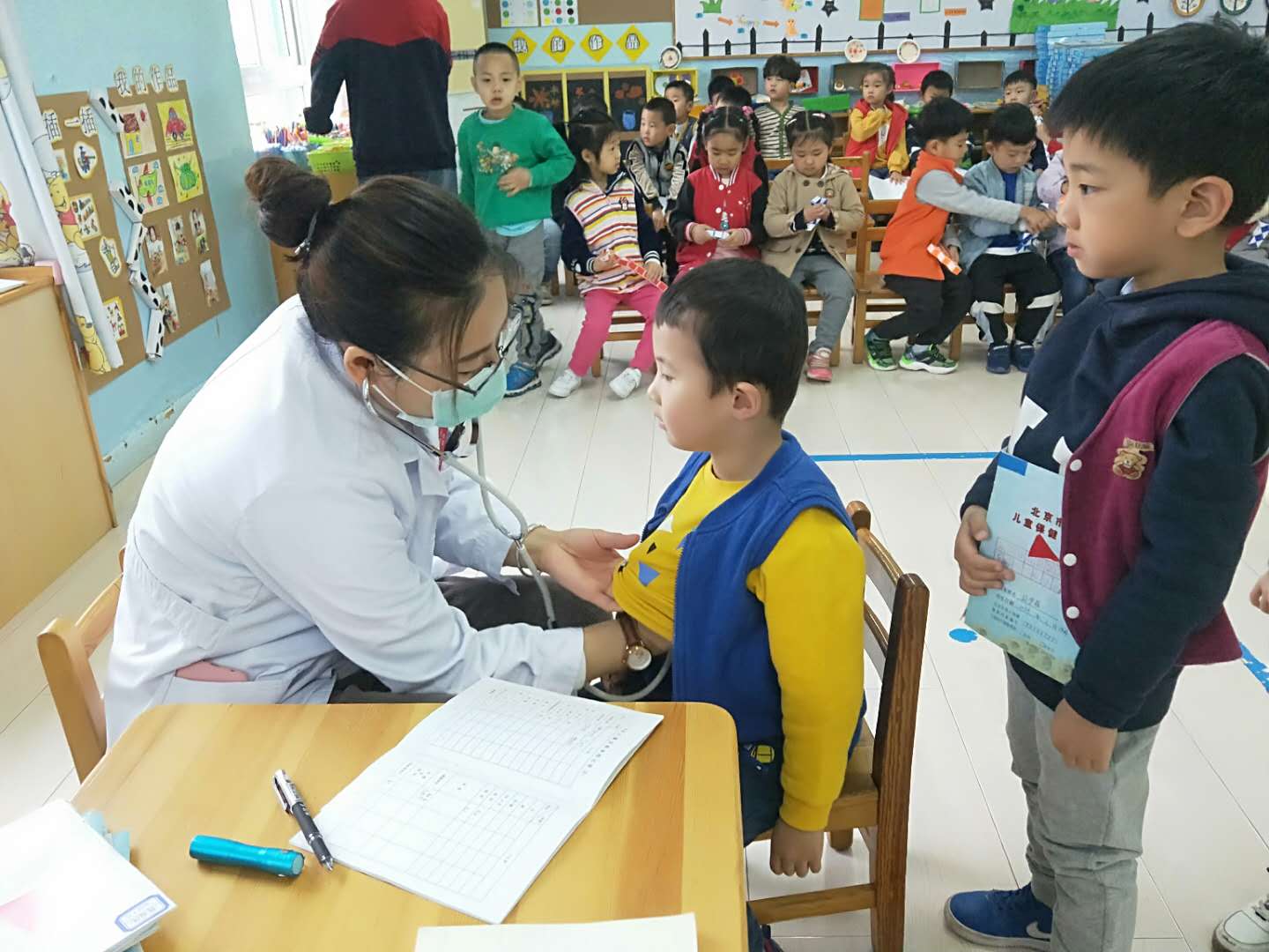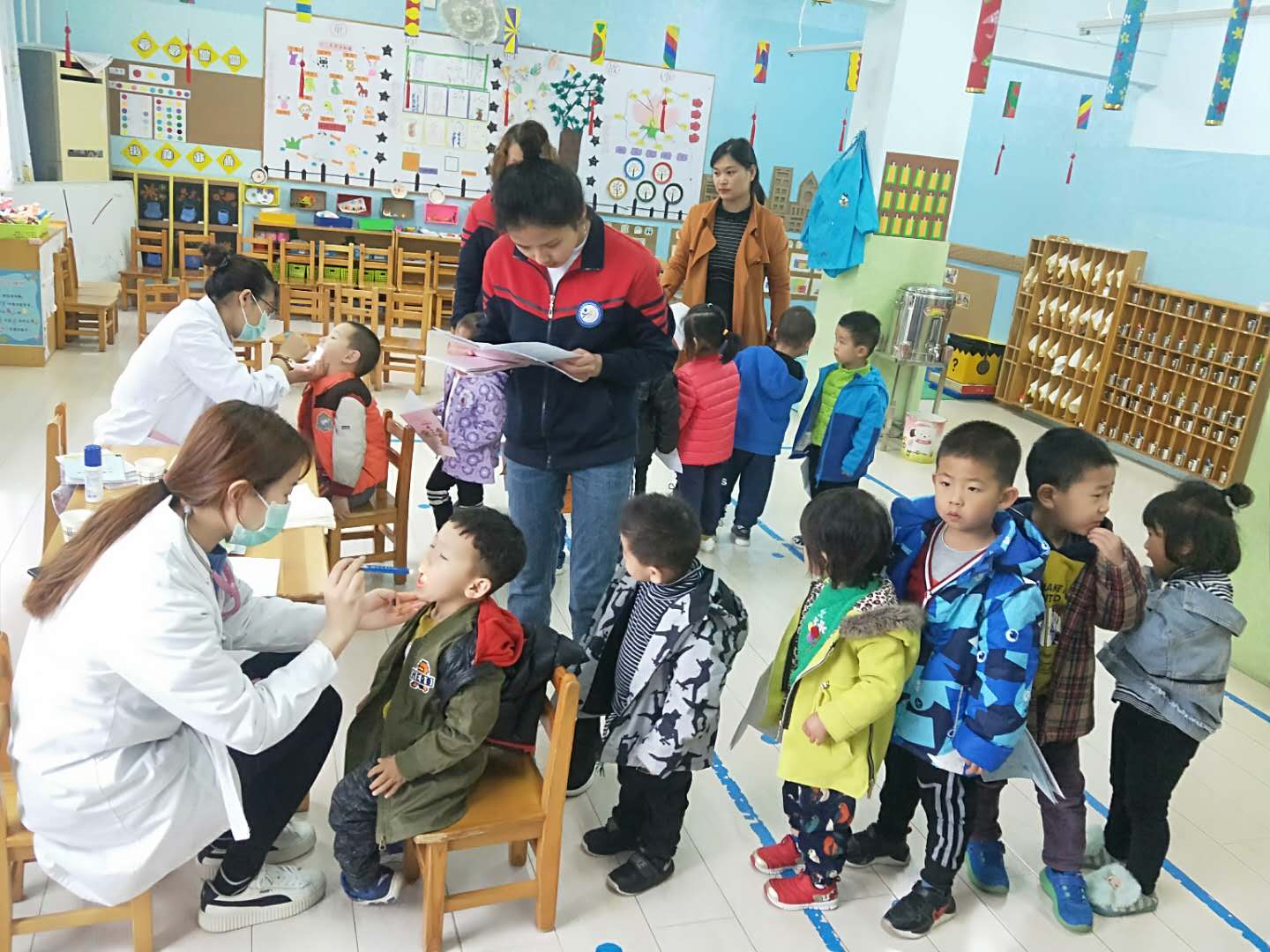 医生们温柔细致地给孩子们检查,孩子们也在老师的组织下井然有序地进行体检。