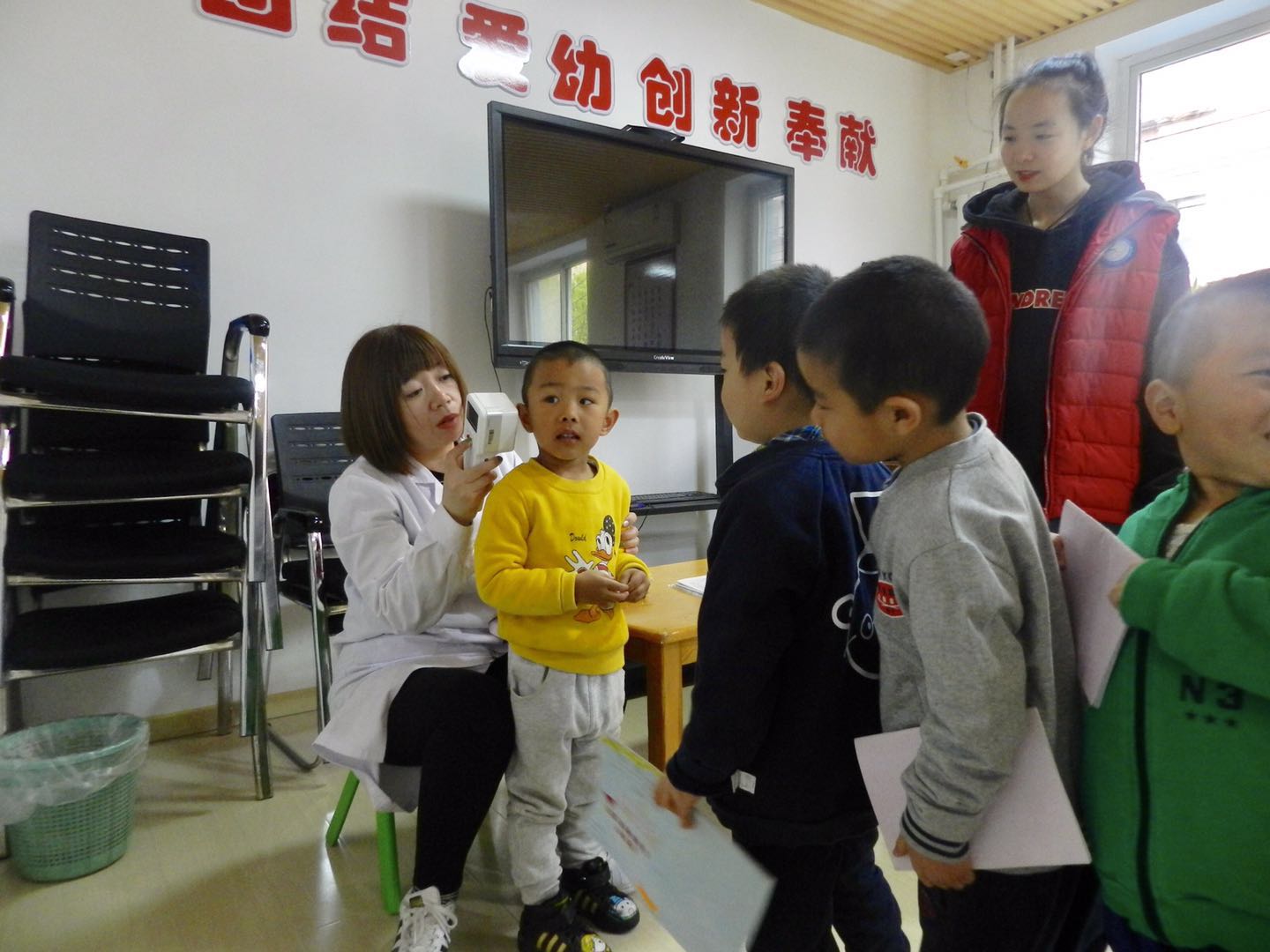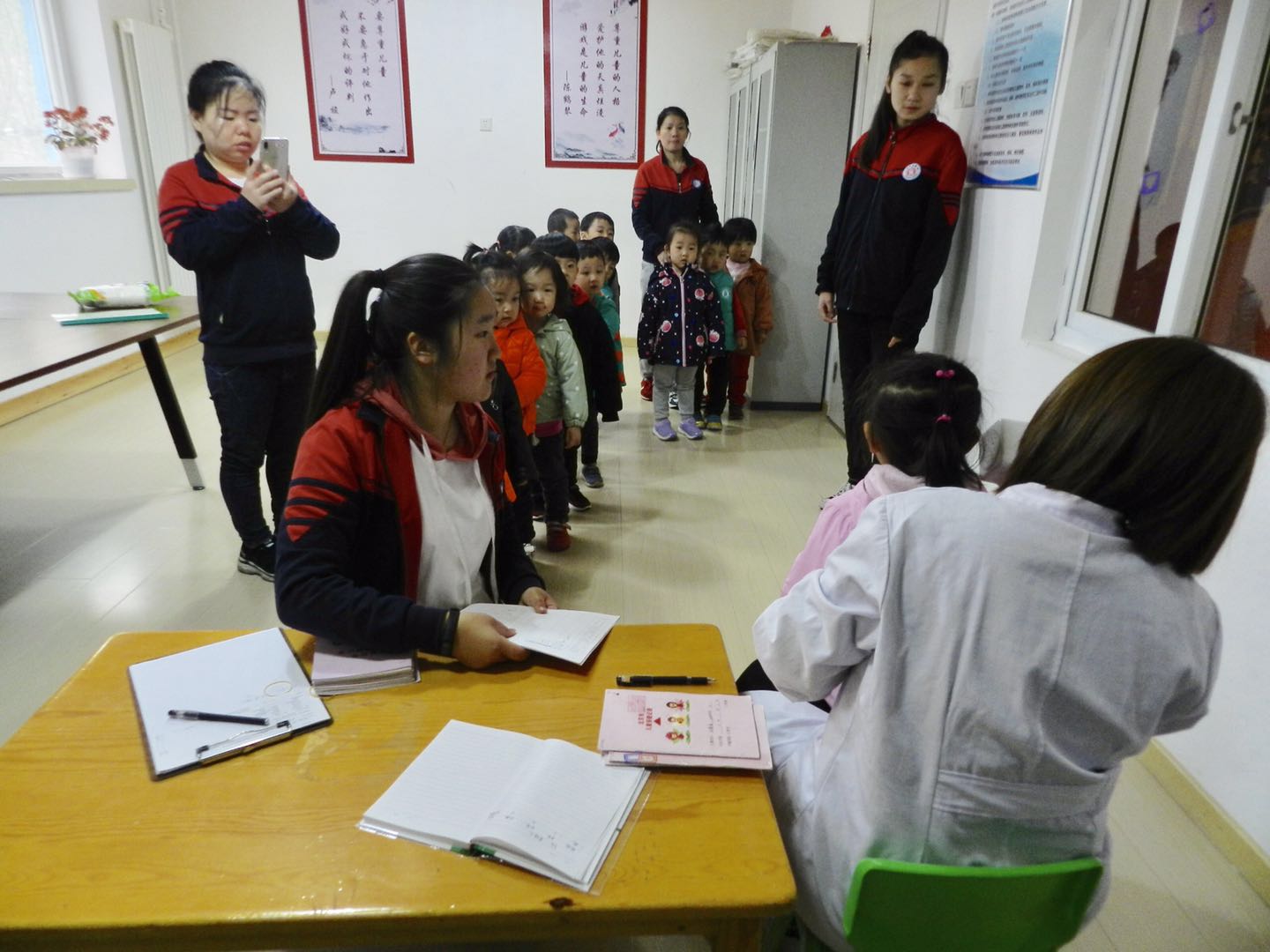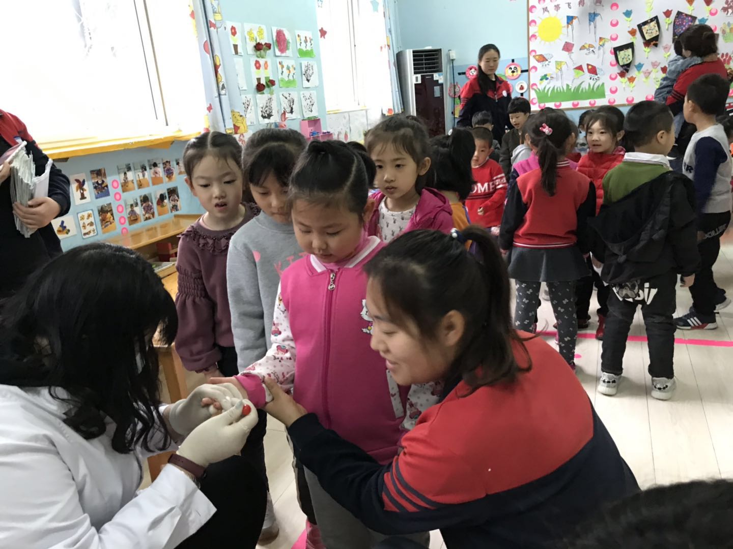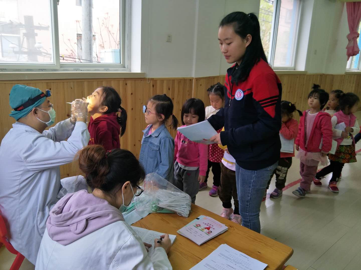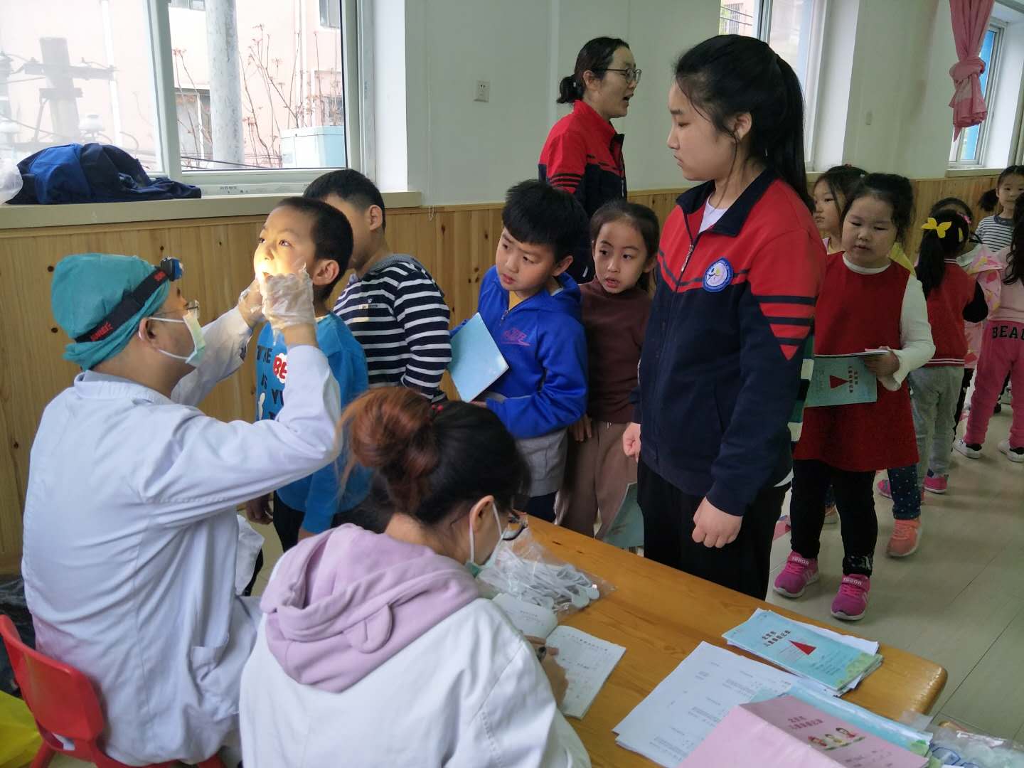 医生们温柔细致地给孩子们检查,孩子们也在老师的组织下井然有序地进行体检。
