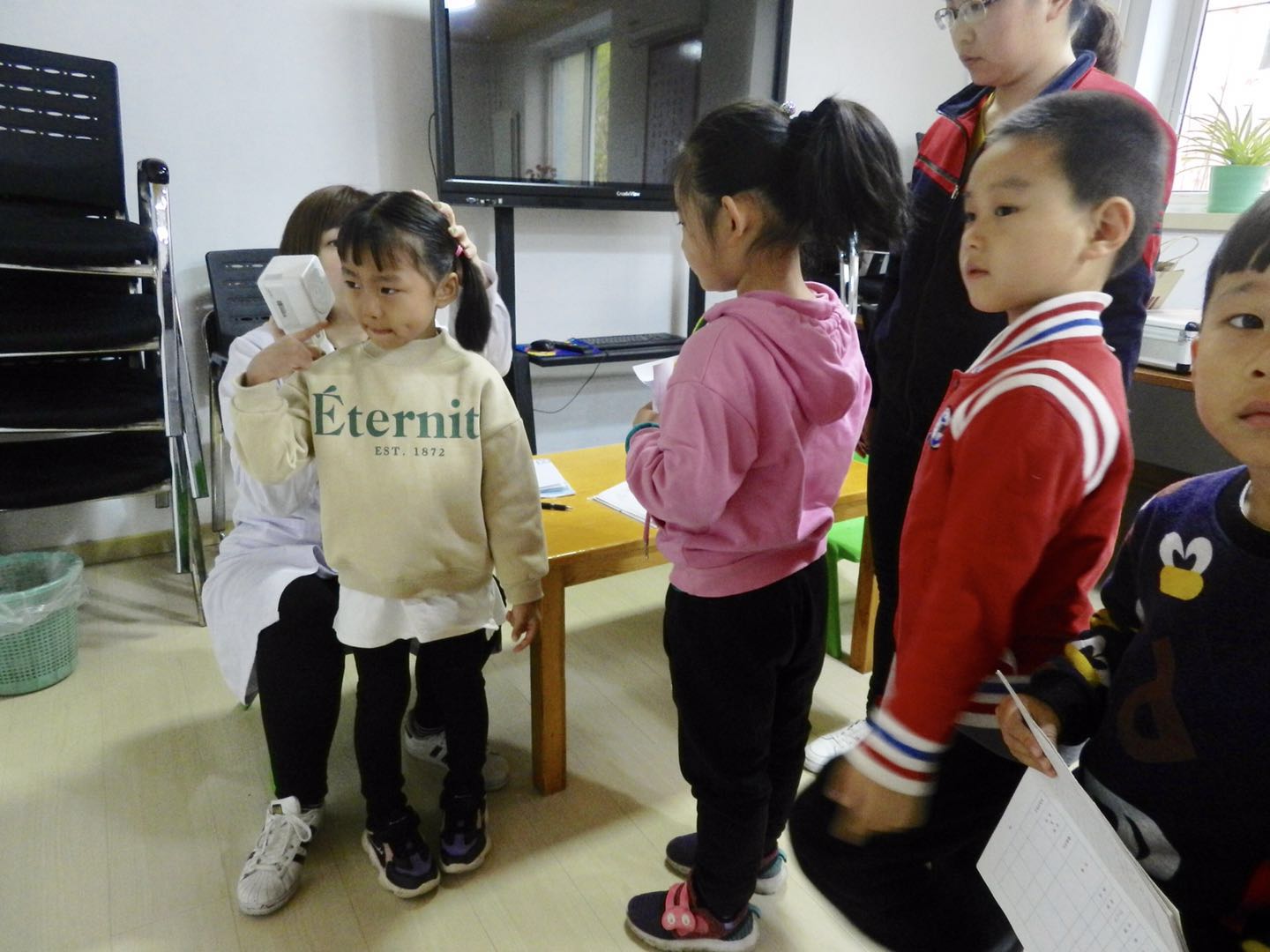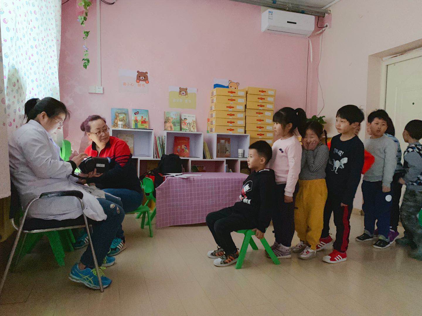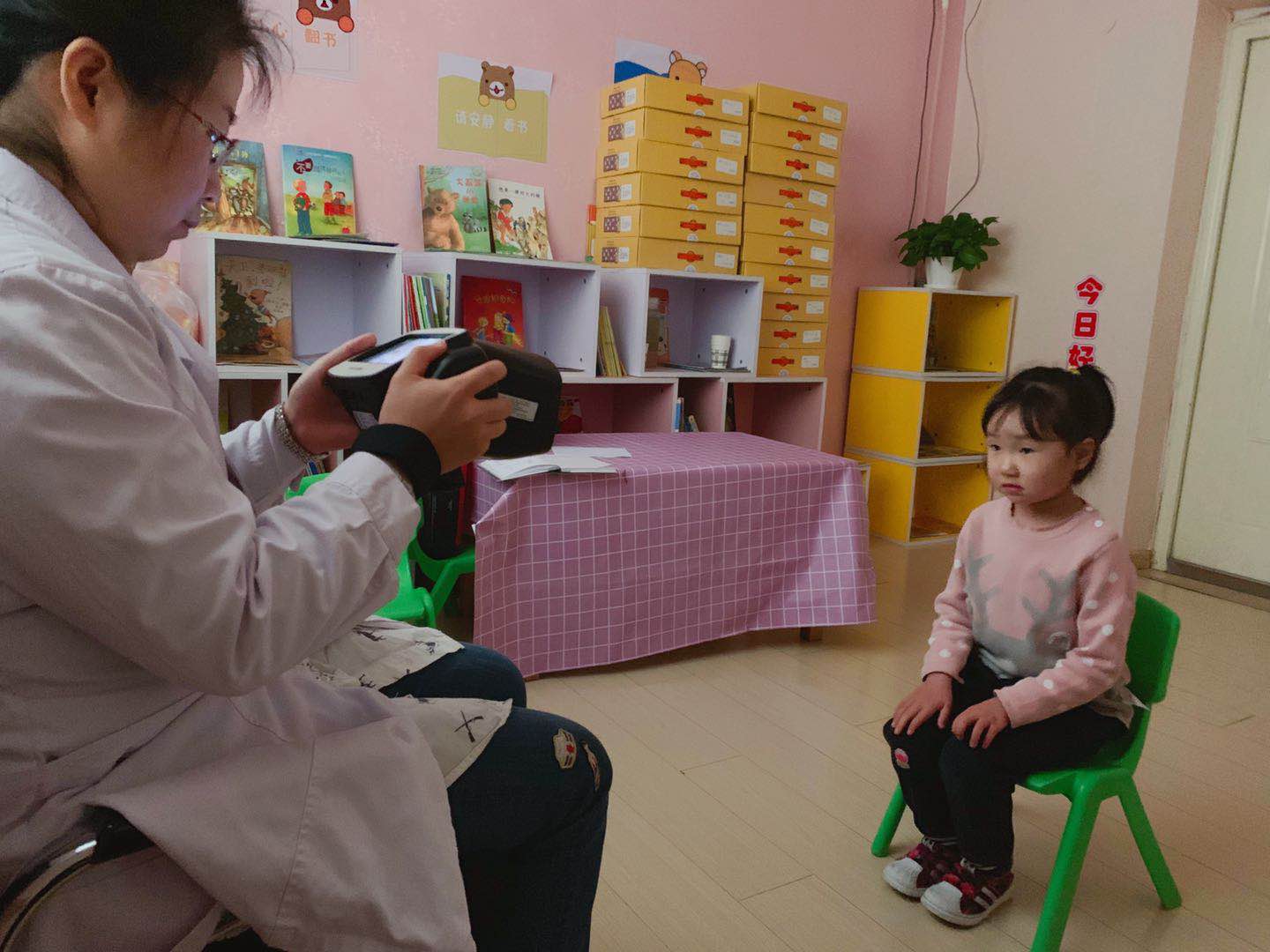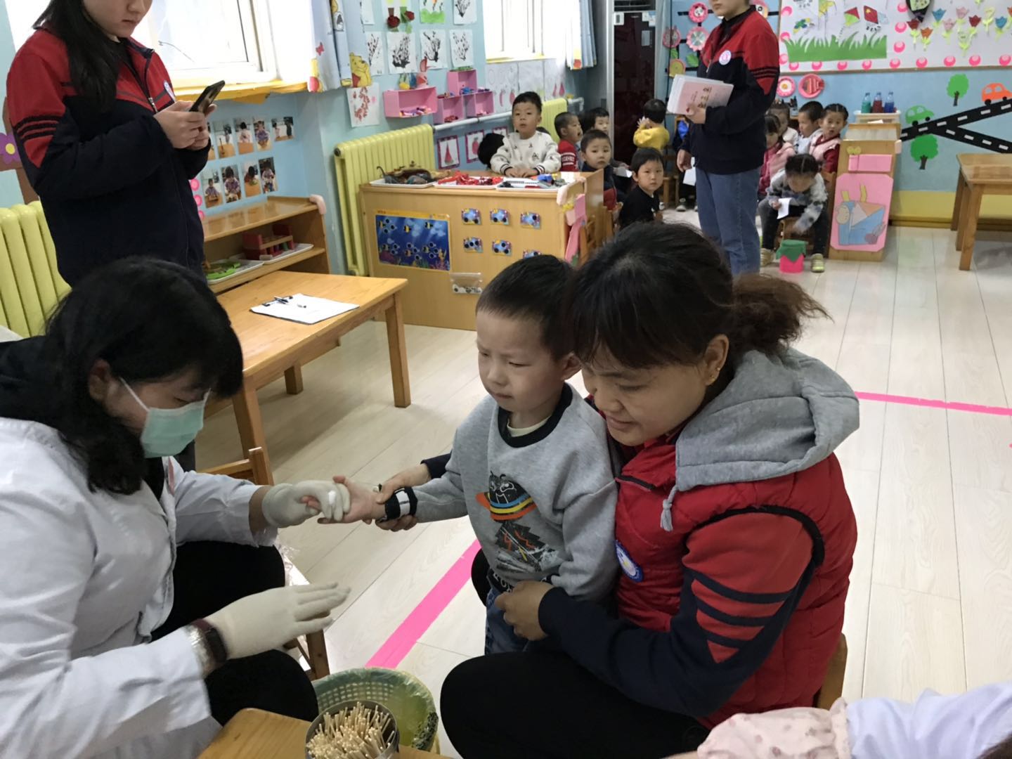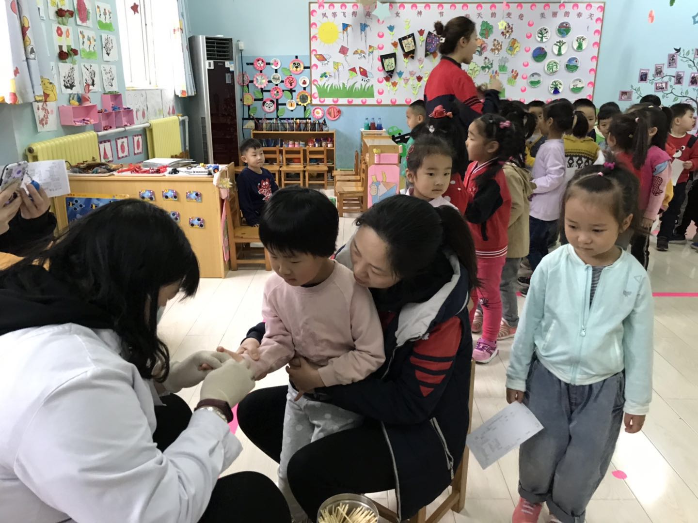 医生们温柔细致地给孩子们检查,孩子们也在老师的组织下井然有序地进行体检。