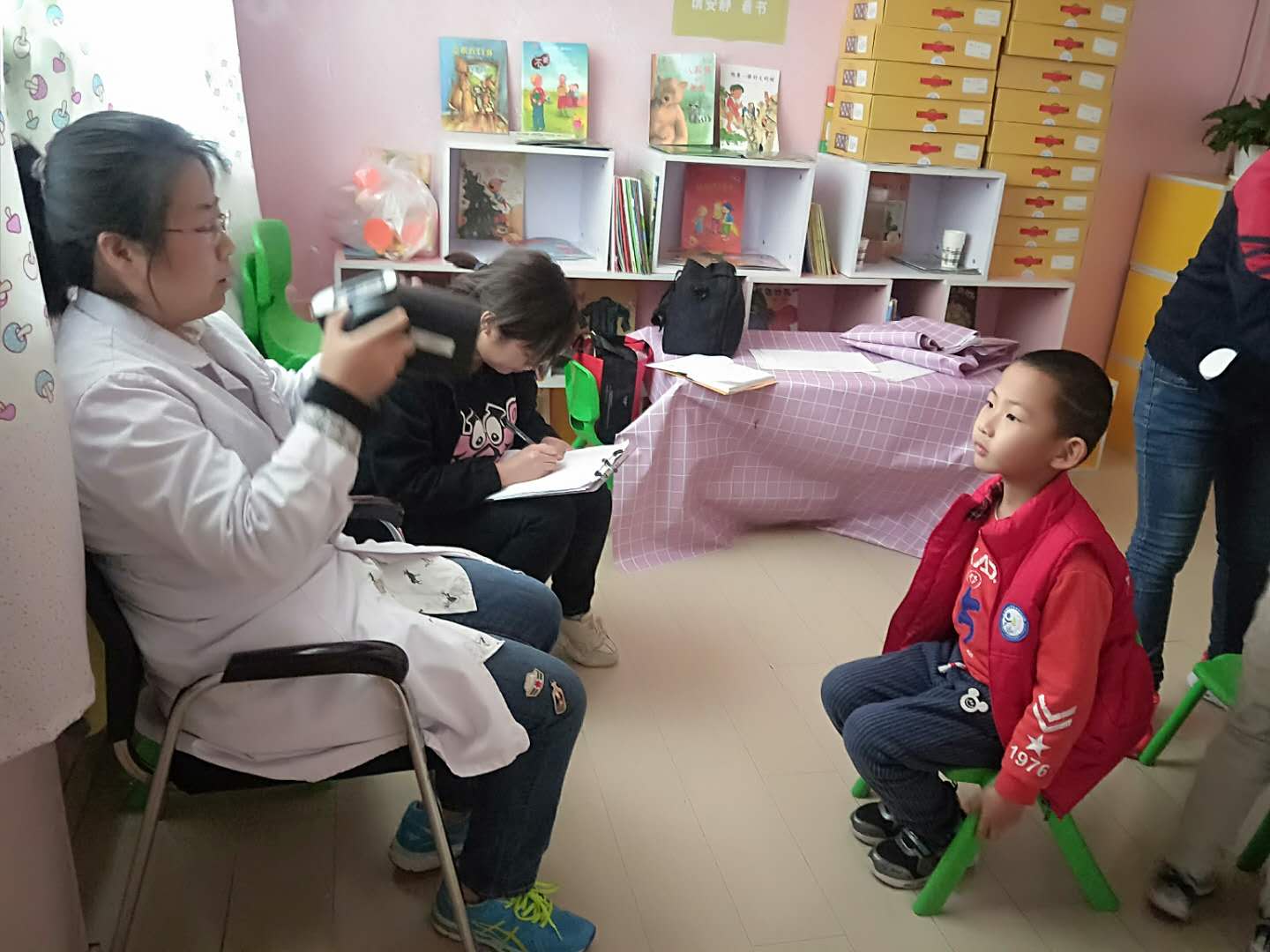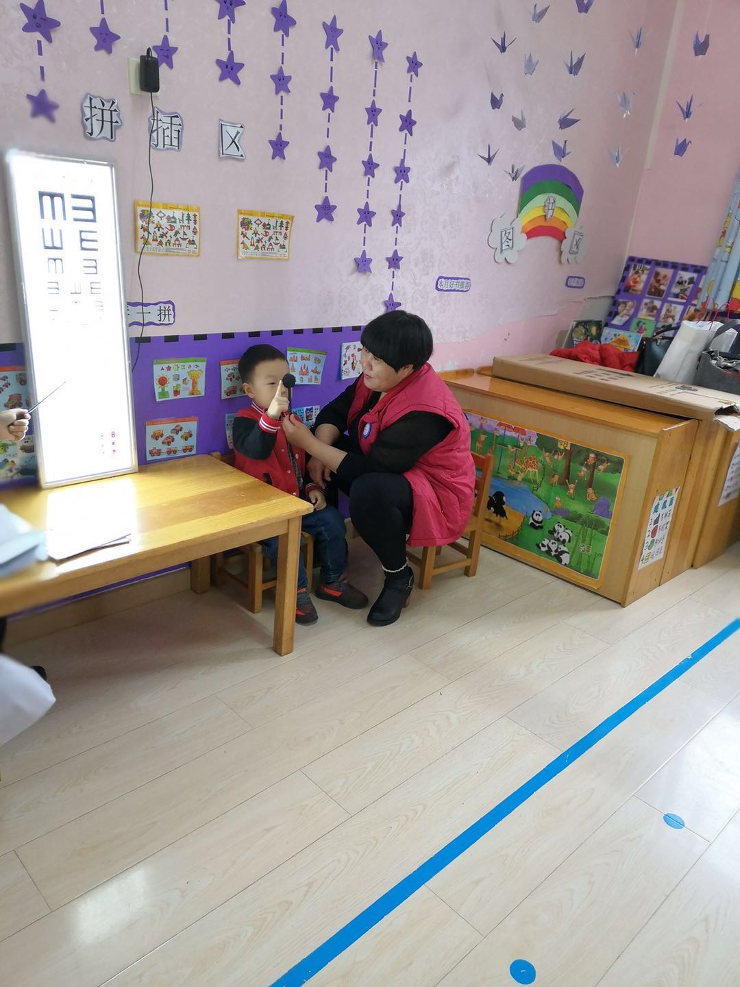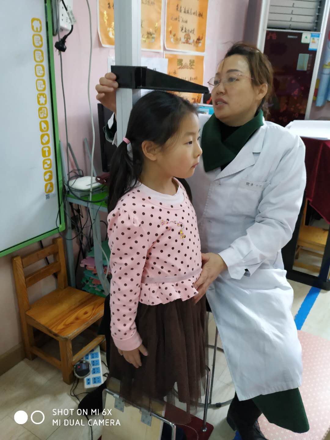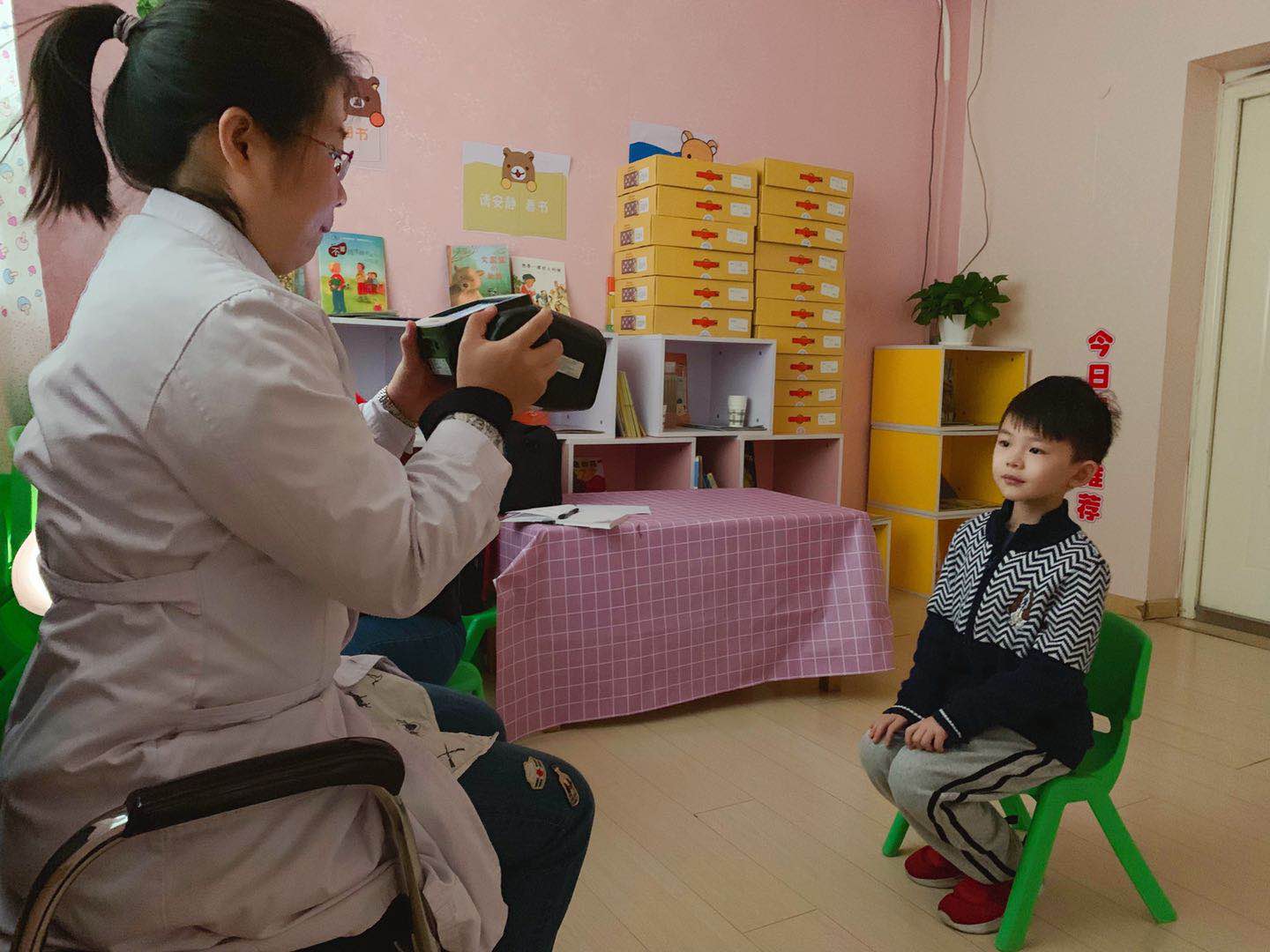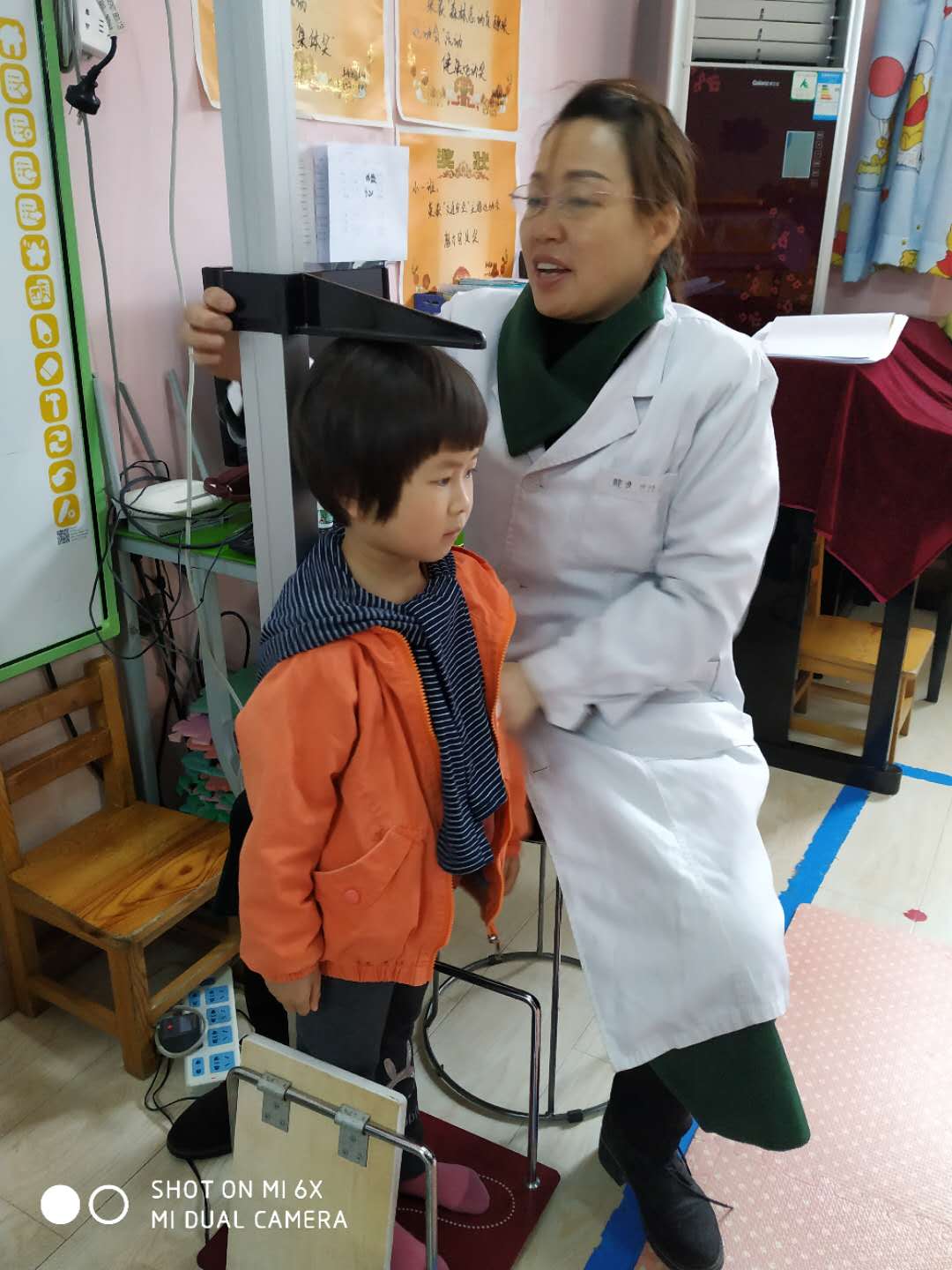 医生们温柔细致地给孩子们检查,孩子们也在老师的组织下井然有序地进行体检。