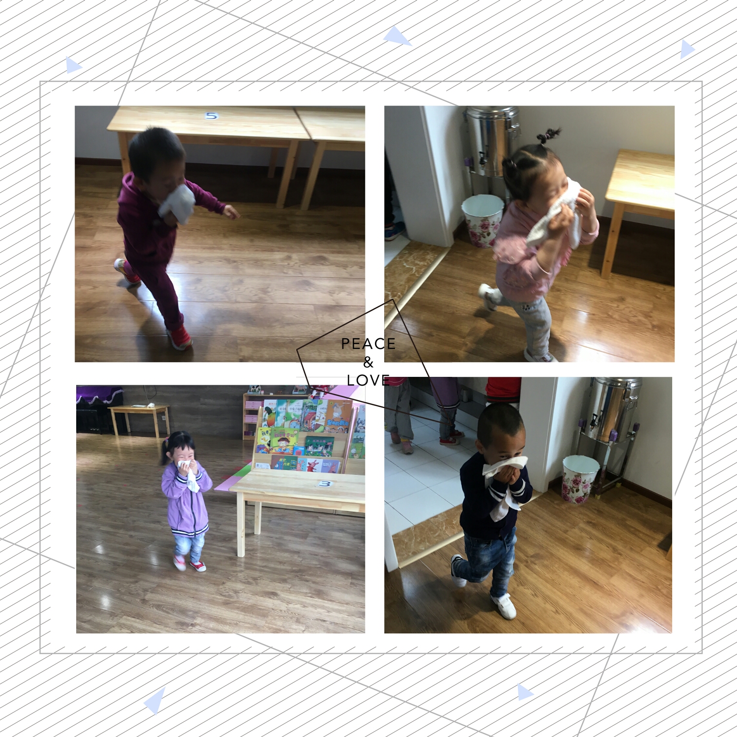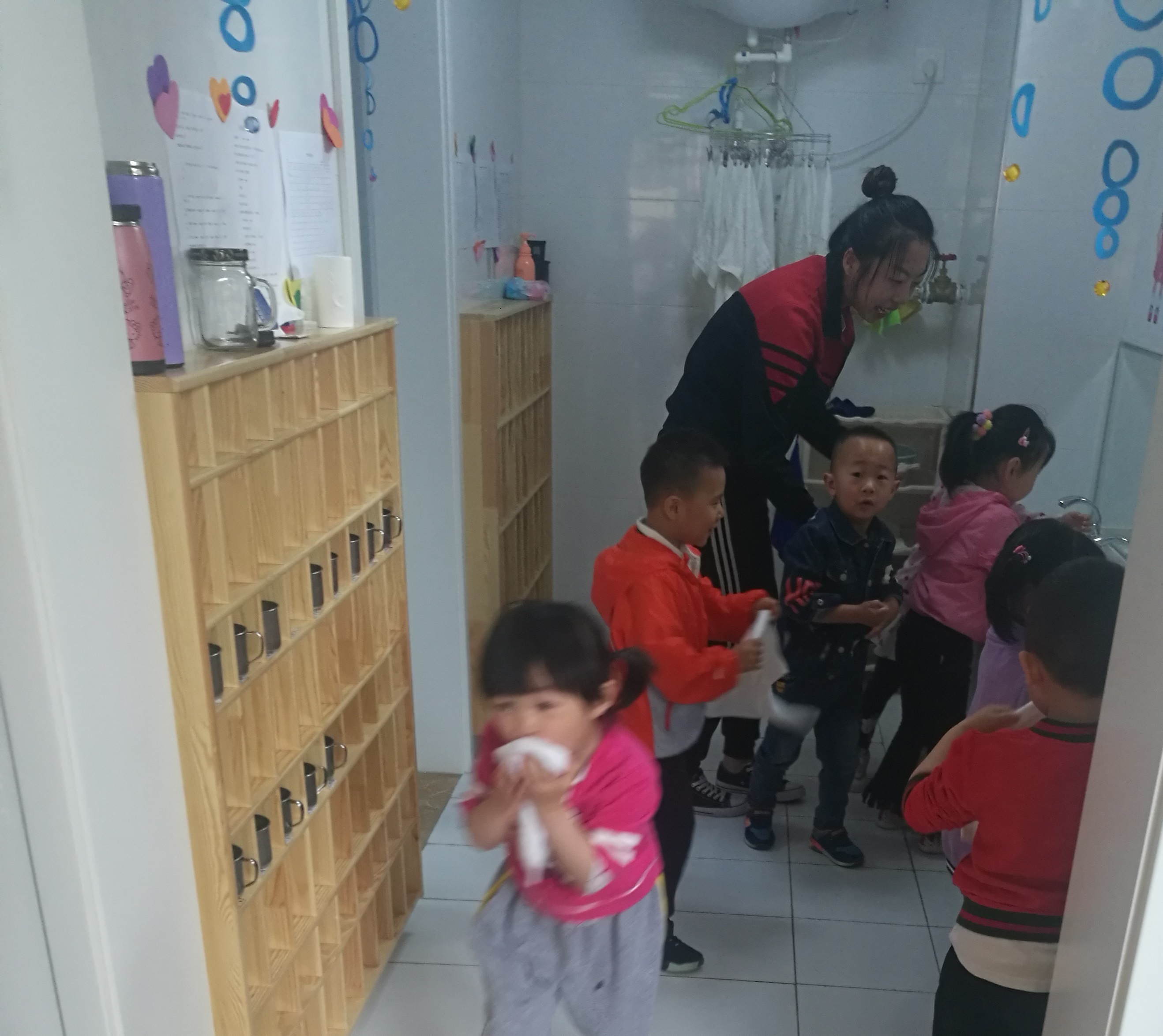 幼儿不吵不闹,紧张而有序的一个跟着一个,按照本班的疏散路线,有秩序的撤离。一名老师负责帮助孩子毛巾沾湿,一名老师在前面带领幼儿撤离,另一名教师走在队伍最后面,防止有幼儿没有逃离。