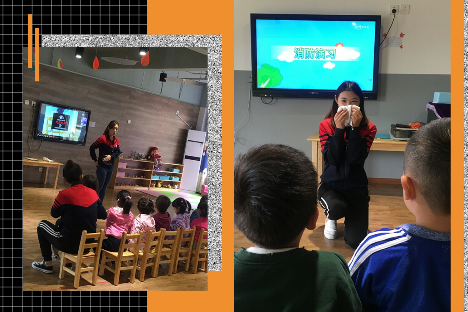 当天上午9:00消防警报声响起,各班教师组织幼儿迅速用湿毛巾捂住口鼻低头弯腰逃离现场。