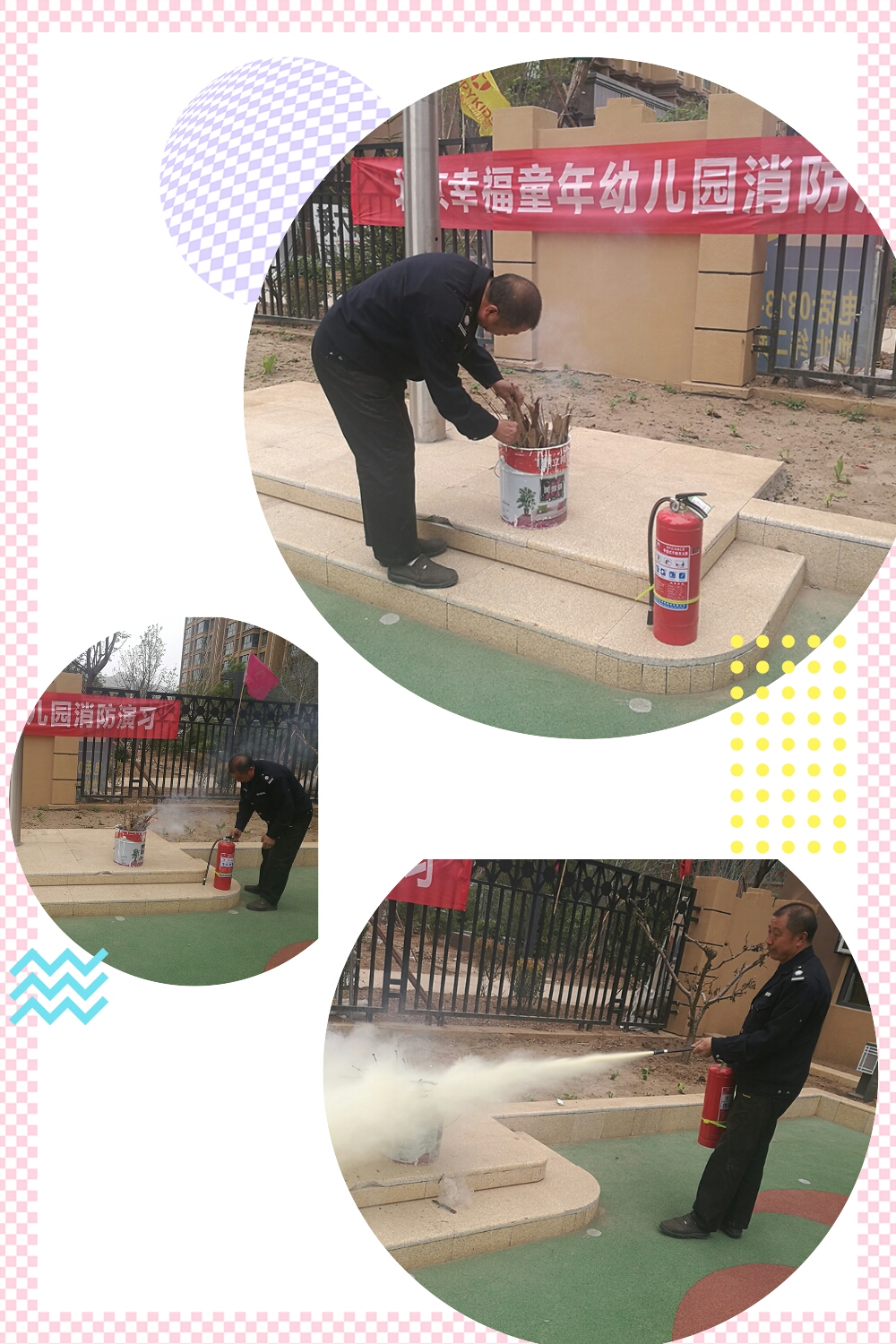 请门卫赵师傅在已经点燃的火堆上,演示了用干粉灭火器的全过程。握住灭火器的软管对准火源处喷射。